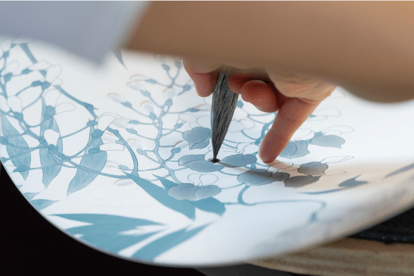 そして、繊細で麗しい表現力に富んだ藍のグラデーション。数種類の青と灰色は、芸大時代から呉須の調合・実験を繰り返し、研究を重ねてきた。野葡萄や青紅葉などを描く際は、そこに独自に開発した緑も加わる。青、灰色、緑の3色の藍だけで、見る人によって植物の多彩な色を想起させるのだ。
