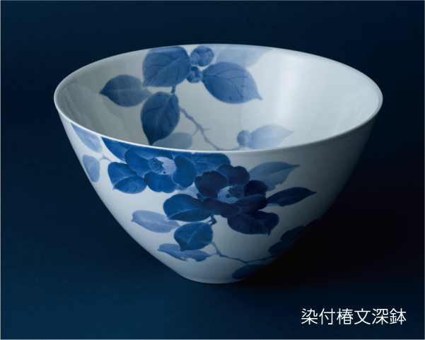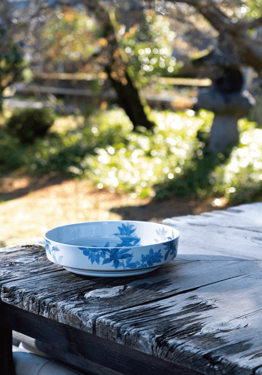 透き通るような⽩磁に、花弁がやわらかく浮かび上がる。彫りの陰影と表情豊かな藍のグラデーションが麗しく調和する。藍色と灰⾊、そして緑、それだけで植物の鮮やかな⾊彩まで感じさせる。⽣まれ故郷である奈良の地で、陶芸家・本多亜弥はモダンなデザインに加えて技法や⾊の開発に挑み、「染付」の美しい藍の世界に、独⾃の新しい⾵を吹き込んできた。