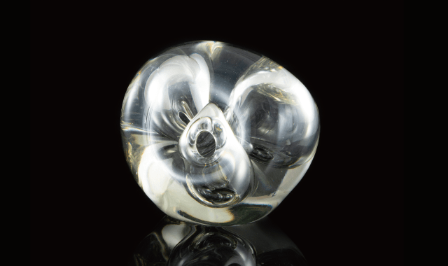 その魔法とも言える創作は、瞬く間に液体から固体へと変容する溶けたガラスの混沌とした状態を見極める研ぎ澄まされた観察眼と、全身の感覚を使ってガラスという素材と一体化する卓越した技術によってなされる。