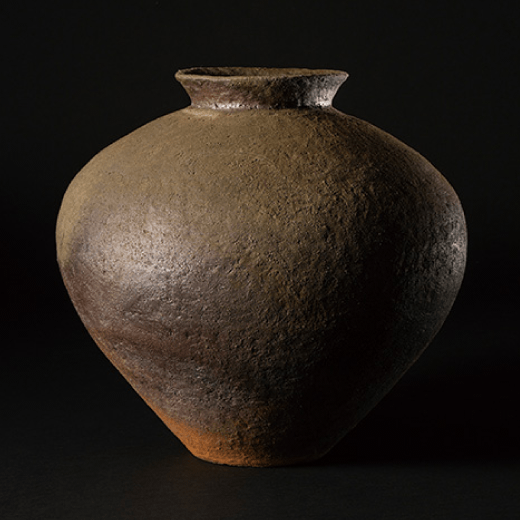 初めて今⻄公彦先⽣の丹波⼤壺を⽬にしたときの驚きは今も忘れません。灰が降りかかり⾃然釉と⼟味による景⾊が古丹波の美を感じさせつつ、特徴的な⼝造りや胴がしっかりと張ったフォルムなど、独⾃の感性と技術による造形が圧倒的な存在感を放っていました。しかも若い作家がこのような作陶をしているのか、と興味が尽きませんでした。