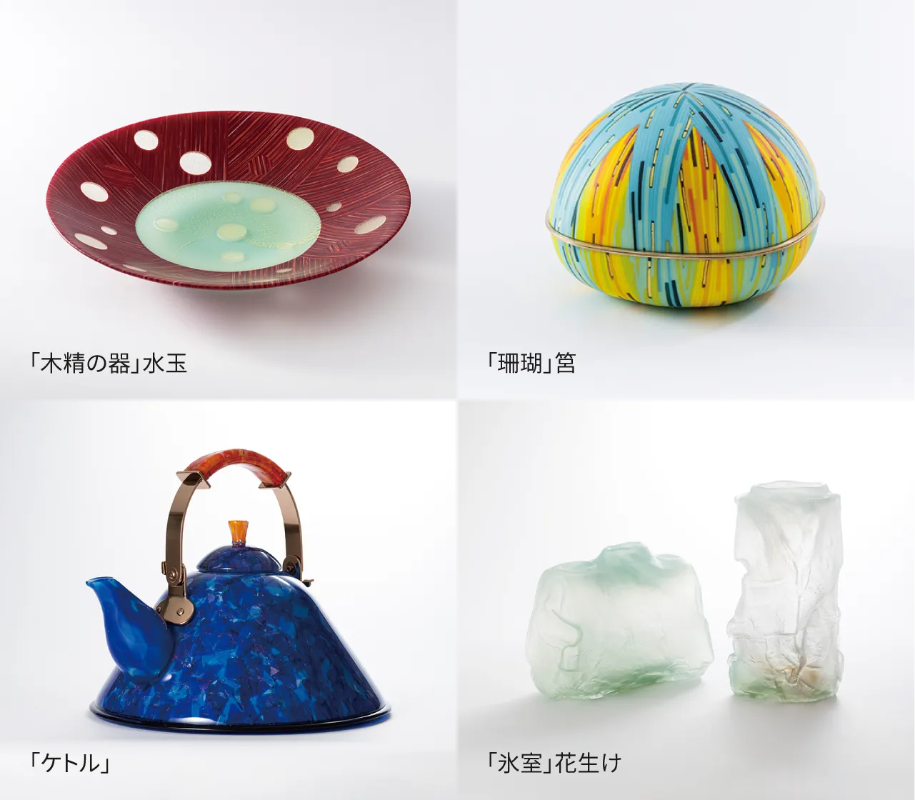 まるで寄木細工のような『木精の器』。やかんをモチーフにデザインされた大胆かつ色鮮やかな大型オブジェ『ケトル』。