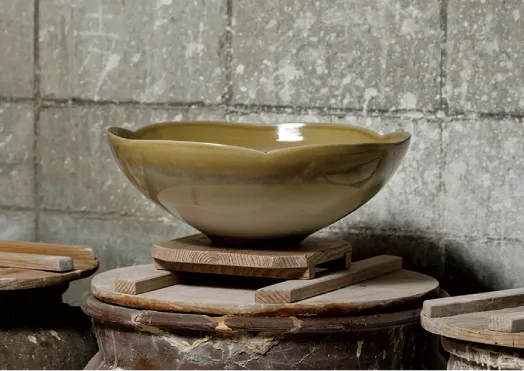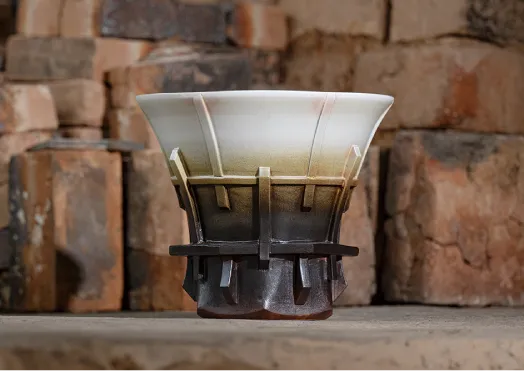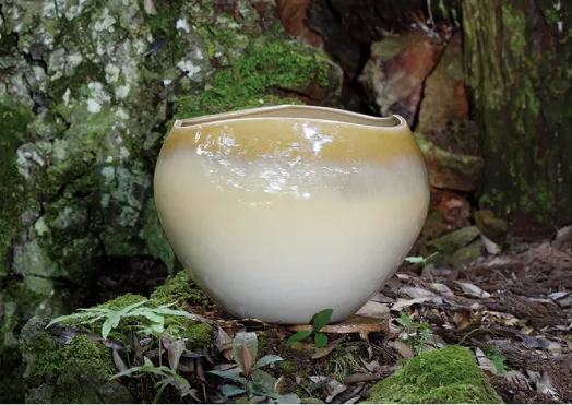 古窯跡に残された古い陶片からヒントを得て出来上がった「流白釉」の器。伝統的な土と釉薬を活かしながら独自の造形に昇華させた「纏景の器」。