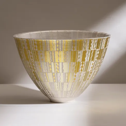 金銀の箔の層が磁胎の質感と一体となって深い煌めきを生む、高橋朋子の「金銀彩」。