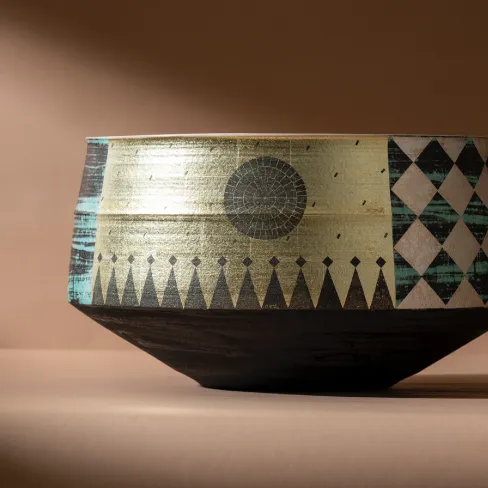 次第に特徴的な幾何学文様が美しく整理され、意匠と造形の調和が進化していきます。金と銀以外にも、金属箔を用いて黒や緑に発色させる方法や、染付の呉須を吹き墨で掛けて作った下地に銀彩を組み合わせる「蒼掌」など、はじめは完成に至らなかったさまざまなアイデアも、技術を磨き経験を積み上げることで独自の技法へと昇華。金銀の光彩とともに、作品全体が一層奥深い趣を纏うようになりました。「この数年、自分の納得できる作品が作れるようになった」とご自身でも語るように、独特の感性がもたらす心象の世界が器の上で見事に現出し、今まさに我々の眼前に唯一無二の「金銀彩」が花開いているのです。公募展などでも数々の受賞を重ね、2024年には日本伝統工芸展においてNHK会長賞の受賞を果たされました。