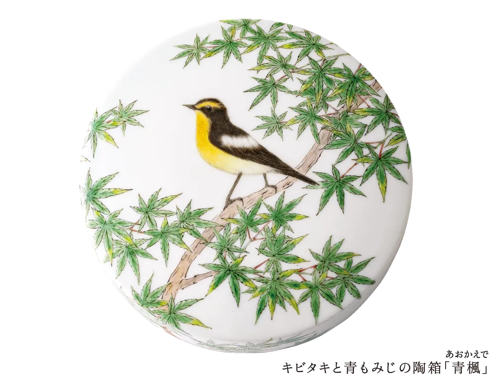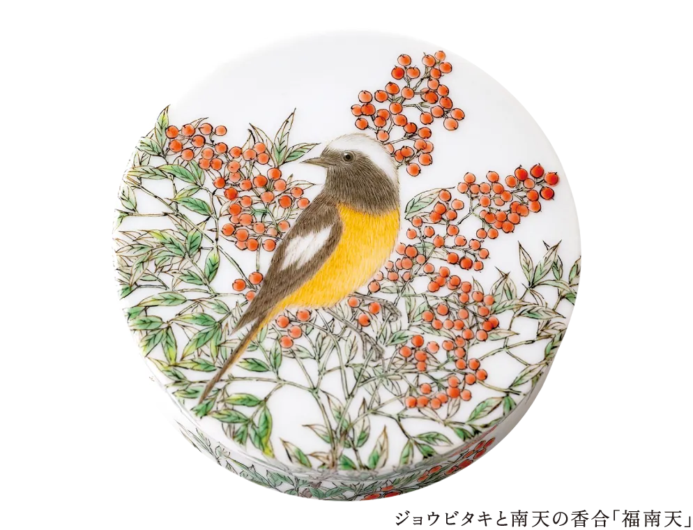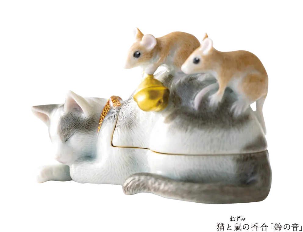 青空に映える桜の花と、桜の甘い香りに誘われたメジロをあしらった春らしい香炉、青もみじの枝で羽を休めるキビタキの姿を描いた陶箱、ネズミが猫の首に鈴を付ける相談をする童話『ネズミの相談』を思い起こさせる愛らしい香合、つがいの鹿の姿をやわらかい造形と筆致で描き出した香合……。